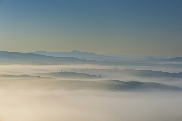 "Lever de soleil en Toscane" poster de Walter G. Allgöwer. Une brume matinale enveloppe les collines de Toscane comme un voile mystérieux. Le brouillard joue à cache-cache avec la lumière naissante, brouillant la frontière entre ciel et terre. Les tons doux de bleu et de vert fusionnent dans une ambiance presque surnaturelle, évoquant la tranquillité de la région de Volterra. On croirait presque que la nature elle-même retient son souffle. Parfait pour une touche d’Italie zen dans votre déco.