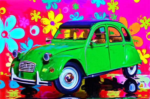 "Surréaliste - 2CV verte" poster de DeVerviers. Cette Citroën 2CV verte claque comme un bonbon acidulé sur un fond psychédélique de fleurs XXL. Le contraste est dingue, entre le rétro cool de la voiture et ce décor qui fait penser à un trip seventies revisité en mode digital. C’est à la fois nostalgique et décalé, un vrai clin d’œil pop qui donne envie de poser ça chez soi pour secouer un peu l’ambiance. Un rêve vintage qui ne se prend pas au sérieux, mais qui assure grave niveau style.