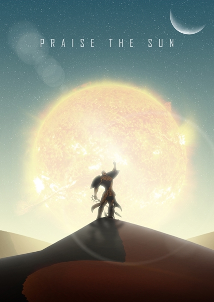"Escanor Les Sept Péchés Capitaux" poster de saufa haqqi. Un héros immense, silhouette fière, bras levés vers un soleil déchaîné qui écrase le désert. L’astre brûlant, presque à portée de main, éclaire un ciel étoilé où une lune en croissant joue les trouble-fête. « PRAISE THE SUN » claque au-dessus, comme un mantra solaire. Cette illustration capte l’énergie brute d’un anime culte – puissance, lumière et ce petit frisson épique qui donne envie de hurler avec lui. Impossible de rester de marbre.