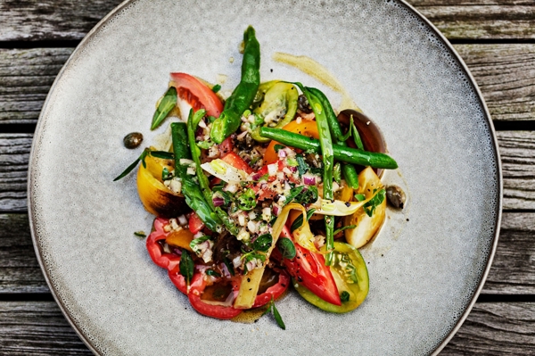 "Captured on a summer day in natural light, this salad of heirloom tomatoes, beans, and herbs reflects the beauty of fresh ingredients and Nordic simplicity."