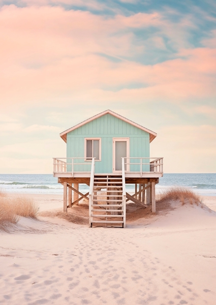 "Plage du coucher de soleil du Pacifique" poster de Philippe HUGONNARD. Une cabane en bois turquoise posée sur pilotis, face à l’océan calme. Le sable fin trace un chemin discret vers l’entrée, comme une invitation à s’évader. Le ciel pastel, rose et bleu, s’étire en nuages légers – un vrai tableau digne d’un rêve californien. Ça sent l’été éternel, le sable chaud et les soirées qui s’étirent sans prise de tête. Parfait pour ceux qui veulent garder un bout de plage à portée de main, même quand l’hiver tape à la porte.