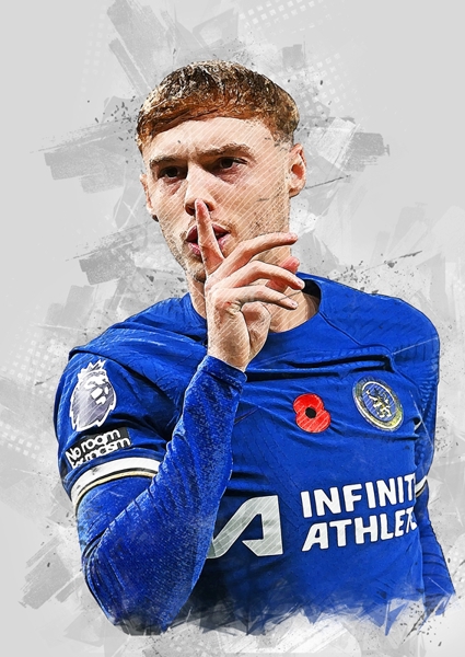 "Cole Palmer" poster de Taipottinger. Une explosion de bleu électrique qui accroche direct le regard. Cole Palmer, doigt sur les lèvres, invite au silence – ou à la concentration intense, à toi de voir. Le fond abstrait, façon esquisse floue, donne ce côté brut, presque street art, qui colle parfaitement à l’énergie du foot moderne. Un portrait qui respire le jeu, la confiance, et ce petit je-ne-sais-quoi qui dit « attends, ça va kicker ». Parfait pour booster un mur avec du style et un brin de mystère.