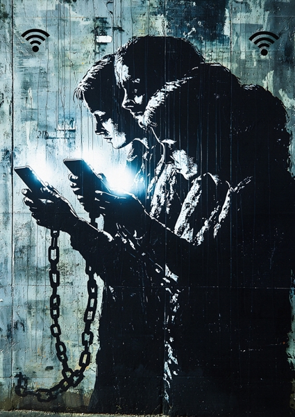 "Esclaves numériques Banksy Art" poster de Alex Morgan. Trois silhouettes enchaînées, hypnotisées par la lueur bleutée de leurs écrans – ça claque, non ? Une critique mordante de notre époque, où la connexion numérique vire souvent à l’aliénation pure. Banksy capte ce paradoxe avec son style graffiti ultra reconnaissable, façon pochoir urbain. Un trio figé dans sa dépendance, sous le signe du Wi-Fi, comme si la liberté numérique s’était transformée en cage. Parfait pour pimper un mur avec un message qui fait mouche.