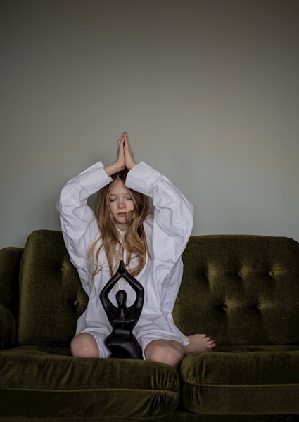 "Bonjour" poster de Helga Hulda Einarsdottir. Un instant suspendu entre mode et méditation – une fille en chemise blanche XXL pose en mode zen sur un canapé vert vintage qui a clairement vu passer des histoires. Les mains jointes, elle canalise un calme presque palpable, tandis que la sculpture noire minimaliste qu’elle tient ajoute cette touche arty qui fait toute la différence. C’est un mix cool entre introspection et design, parfait pour une chambre d’enfant ou un coin chill qui veut respirer un peu. Zen attitude activée, sans chichi.