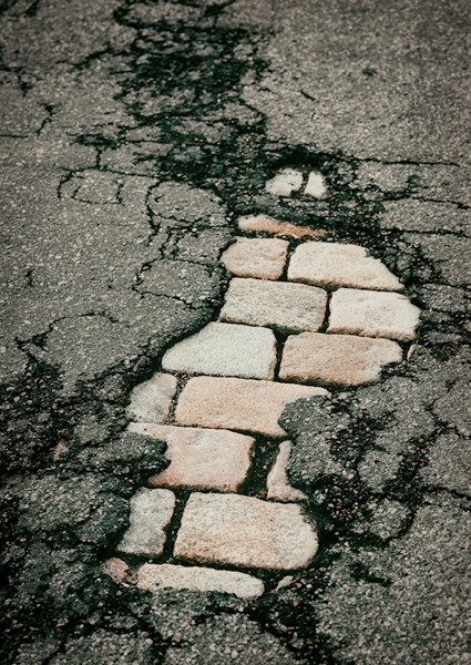 "Old beautiful cobbled street is visible under cracked asphalt"