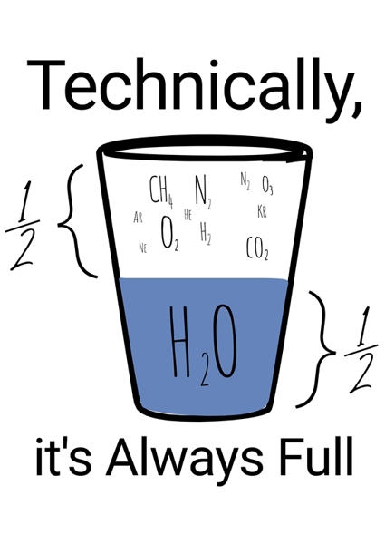 "A glass is depicted half-filled with water and half with air, accompanied by the text "Technically, it's Always Full." The illustration plays with the concept of a "half-full" versus "half-empty" perception. A hand-drawn illustration " Technically, it's always full "depicts a glass of water with the"