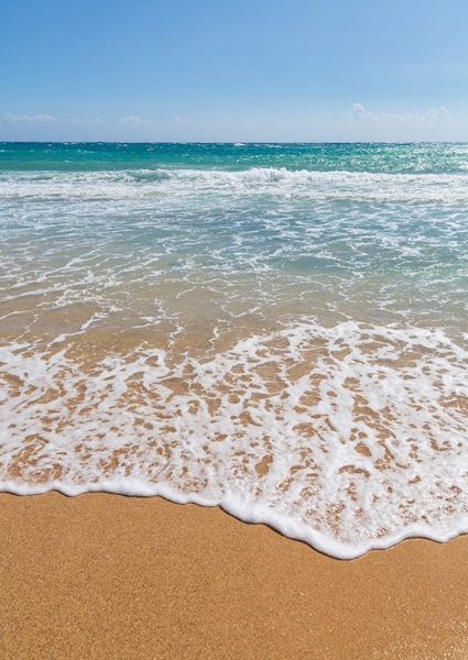 "A beautiful beach in the Mediterranean, the waves sweep in over the warm sand"