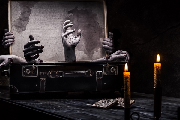 "dalla cripta" poster di Ulf Sjöquist . Mani spettrali emergono da una valigia vintage, come se cercassero di uscire da un mondo parallelo. L’atmosfera monocromatica, interrotta solo dalla luce tremolante di due candele, trasforma la scena in un piccolo set horror da film cult. Perfetto per chi ama l’arte che gioca con il confine tra realtà e incubo, questo quadro è un invito a esplorare l’ignoto senza prendersi troppo sul serio. Halloween tutto l’anno, praticamente.