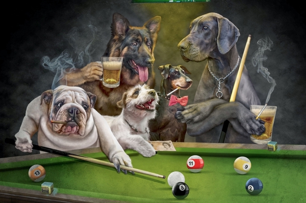 "Cane che gioca a biliardo" poster di Jaman Nurjaman. Un gruppo di cani si sfida a biliardo in un’atmosfera da bar fumoso, dove ogni espressione racconta una storia diversa. C’è il bulldog concentrato pronto al tiro, il pastore tedesco con il bicchiere in mano e il levriero elegante con papillon, tutti immersi in un gioco che sembra più una festa tra amici che una partita seria. Vintage e ironico, questo poster metallico porta una ventata di humour e stile in ogni ambiente.