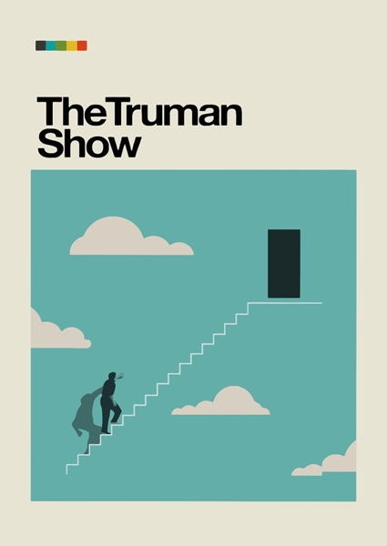"Lo spettacolo di Truman" poster di Kelas Ilakes. Un uomo solitario sale una scala che sembra non finire, verso una porta nera sospesa nel cielo azzurro, incorniciato da nuvole soffici. Minimalismo vintage che cattura l’essenza di The Truman Show, tra realtà e finzione, come un invito a uscire dal proprio mondo prevedibile. Un’icona pop che fa pensare e che, diciamolo, ha quel tocco di nostalgia da film cult che non passa mai di moda. Da non perdere.