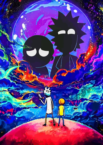 "Rick e Morty" poster di Velenna O. Un’esplosione di colori cosmici avvolge Rick e Morty mentre si stagliano su un pianeta alieno. Le sagome nere sopra la luna gigante creano un contrasto affascinante, quasi come un’ombra di sé stessi, pronti a tuffarsi in un altro viaggio multidimensionale. Tra vortici psichedelici e cieli stellati, l’opera cattura perfettamente quell’alchimia tra caos e curiosità che rende la serie un cult. Un must per chi ama avventure fuori dal comune.