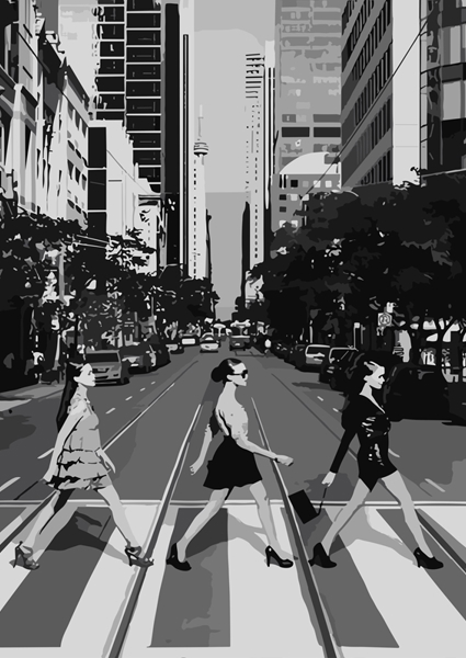 "Moda" poster di mbak asa. Tre figure femminili, sicure di sé, attraversano una strada urbana in stile monocromatico, quasi come se fossero personaggi di un film in bianco e nero. L’atmosfera cattura l’essenza metropolitana, con grattacieli che si stagliano all’orizzonte e una vibrazione che mescola moda e ritmo cittadino. Il contrasto netto tra luci e ombre crea un gioco visivo che non passa inosservato, perfetto per chi ama l’eleganza urbana con un tocco di audacia contemporanea.