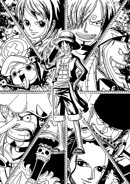 "Monkey D Luffy posing with his friends in their respective character styles."