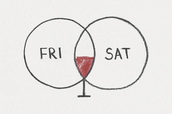 "Carta dei vini" poster di Comfy Zone. Un diagramma di Venn che non si prende troppo sul serio, con due cerchi semplici e una calice di vino rosso che fa da intersezione perfetta tra venerdì e sabato. Minimalismo disegnato a mano, quell’ironia sottile che dice “è qui che succede il vero relax”. Un piccolo manifesto per chi sa quando stappare, senza troppi drammi. Perfetto per chi ama il vino e quei weekend che sembrano fatti apposta per un brindisi. Cheers, senza complicazioni.