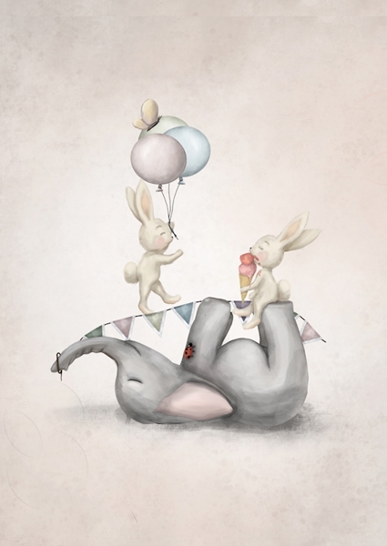 "Drawn children's room print of an Elephant that has a rabbit sitting on its feet eating an ice cream, while another rabbit is balancing and holding balloons."