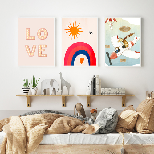 "Liefde is in de lucht, overal waar ik kijk" Je hoeft alleen maar goed te kijken. Naar de muur, bijvoorbeeld. Een combinatie van speelse grafische details en schattige kinderboek illustraties verspreiden een liefdevolle vibe in de kinderkamer.