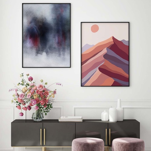 Het abstracte kunstwerk "Hills" van de Göteborg-kunstenaar Irina Balog toont het kleurrijke natuurlijke schouwspel van een zonsopgang. Het is een van onze meest populaire poster paren.