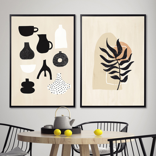 Stijlvolle, minimalistische vormen in beige, zwarte en witte kleuren. Een perfecte poster combinatie voor de moderne keuken of eetkamer