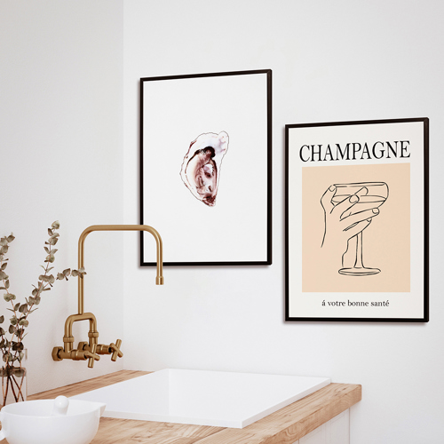 Oesters en champagne, s'il vous plaît! Elegante keuken posters die niet alleen een vleugje elegantie, maar ook een ziel geven aan het hart van jouw huis. Wij proosten op creatief koken en gezelligheid!