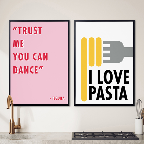 Verleiding komt in verschillende vormen... pasta of tequila? Deze fotowand is moeilijk te weerstaan. Grappige posters met spreuken voor de keuken of eetkamer.