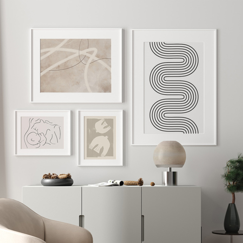 Eenvoudig, ontroerend, harmonieus - de creatieve passie van een breed scala aan kunstenaars versmelt tot een inspirerend totaalbeeld. Een prachtige fotowand met een mix van lijnkunst, abstracte kunst en grafische werken in zachte tinten wit, beige en zwart.
