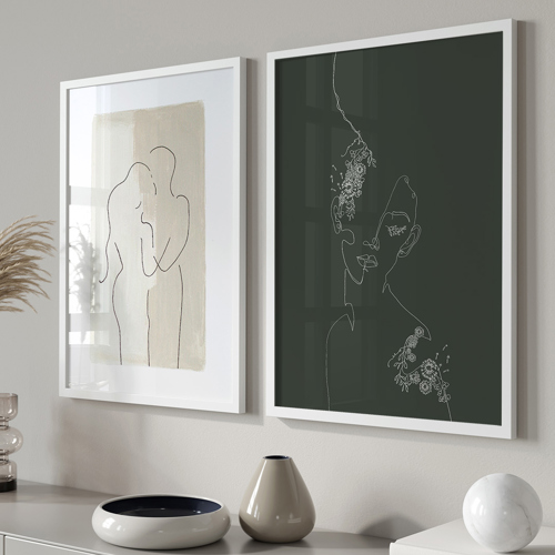 Een match made in heaven – soms zijn een paar lijnen genoeg om sterke gevoelens te creëren. Dit hoog-contrasterende en tegelijkertijd harmoniserende posterpaar met lijnkunst maakt een elegante en romantische indruk op elke muur.