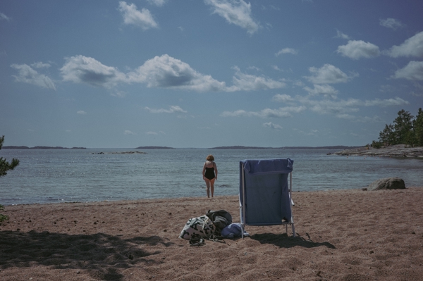 "Oud en zee" poster door Den lilla kameran. Een lege blauwe strandstoel staat uitnodigend op het zachte zand, omringd door een tas en handdoek – klaar voor een momentje zon en niets doen. Iets verder staat een persoon in badpak, starend naar de eindeloze zee en de lucht met losse wolkjes. Die typische zomerdag in Björnö, Stockholm – waar tijd vertraagt en je bijna het geluid van de golven kunt horen. Maar goed, dit is pure zen in een foto gevangen.