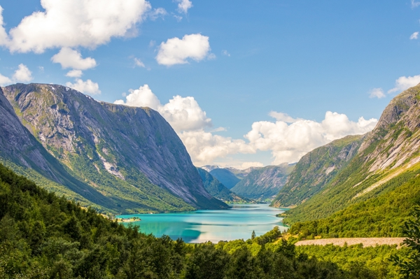 "Noords landschap" poster door Jonathan Skredsvik. Een adembenemend uitzicht op het helderblauwe water van Jolstravatnet, omringd door imposante Noorse bergen. De weelderige bossen glijden als een groene deken langs de steile hellingen, terwijl de lucht speels gevuld is met zachte, witte wolken. Dit landschap ademt rust en avontuur tegelijk – perfect voor wie verlangt naar een moment van ontsnapping in de natuur. Pure Scandinavische magie, gevangen in één frame.