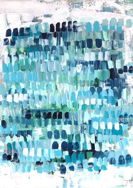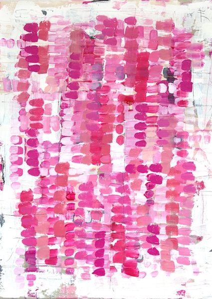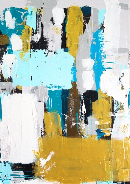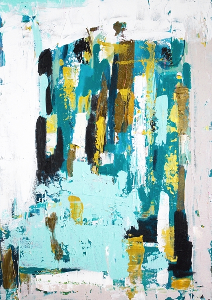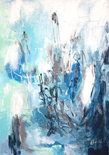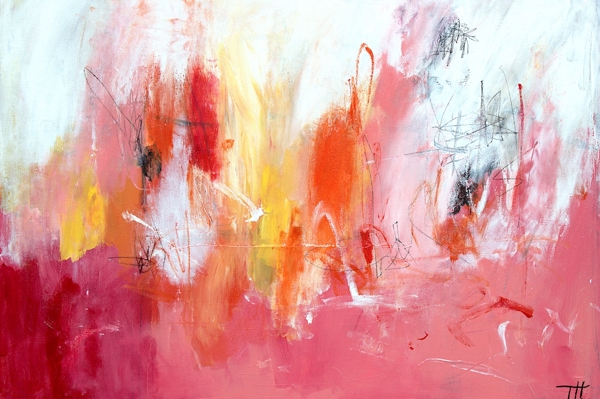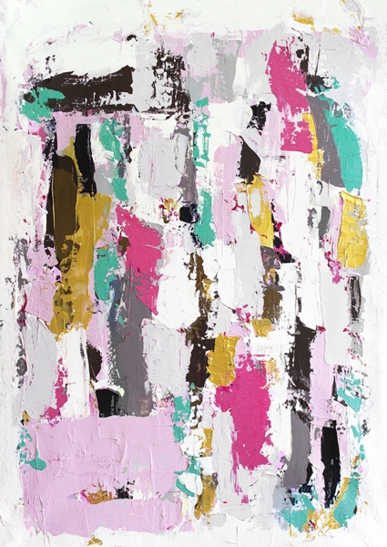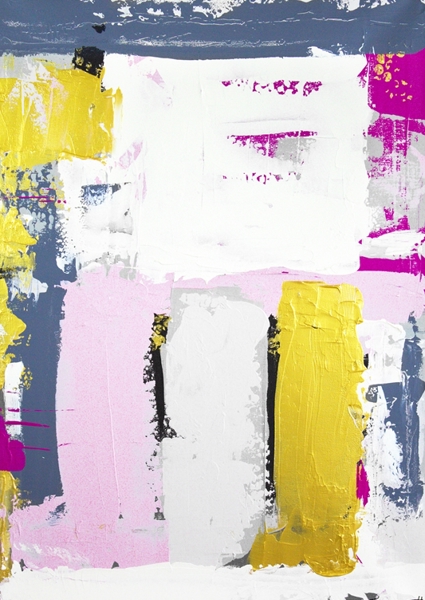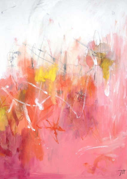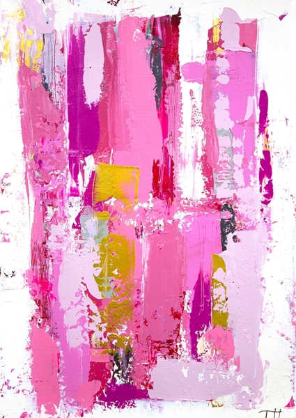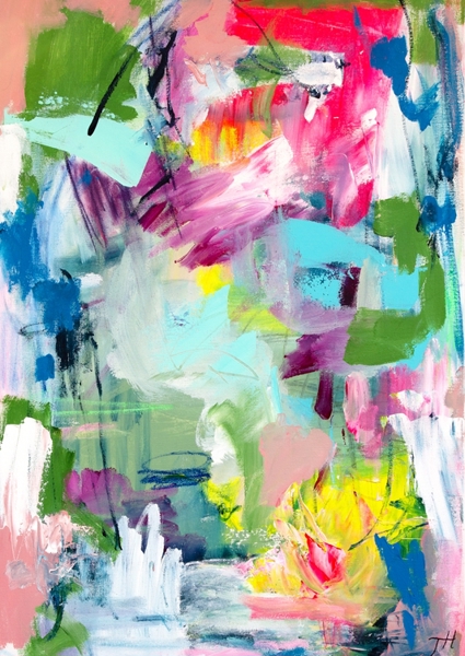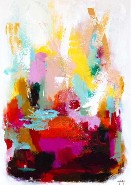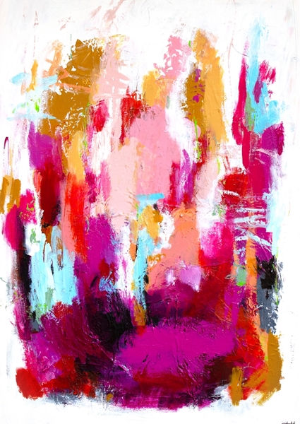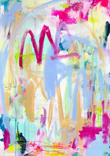 The Swedish artist Tove has a lot of joy in her life, she also shows her power on her canvas, which she expresses with lots of color and strong contrasts. The titles are all quotes from her non-existent bestseller feel-good novel.