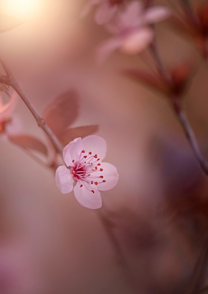 "Kirsebærblomst i solnedgangen" poster av Yasminka Asbun. Et øyeblikk fanget i tid – en kirsebærblomst som danser i solnedgangens varme, rosa lys. Den skjøre blomsten står alene, men roper likevel ut sin skjønnhet med detaljer som nesten hvisker. Perfekt for deg som vil ha en pause fra hverdagens mas, og heller drømme deg bort til vårens flyktige magi. Veggkunst som gjør rommet litt mykere, litt mer levende. Men vent – det er mer enn bare en blomst her.