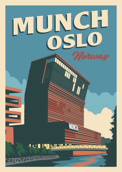 "Munchmuseet, Oslo" poster av Ruth Sparkes. Her møter du Munchmuseet i Oslo – en skarp, retrohyllest til en arkitektur som både provoserer og fascinerer. Den tårnende fasaden, nesten som en kontrolltårns-vibe, fanger byens pulserende energi og Edvard Munchs kunstneriske arv. Perfekt for alle som digger vintage reiseplakater og vil ha et kult blikkfang med lokal sjarm på veggen. Litt som å ha en del av Bjørvika hjemme. Men vent… ser du hvordan fargene leker mellom himmel og vann? Det er Oslo, pakket inn i nostalgi.