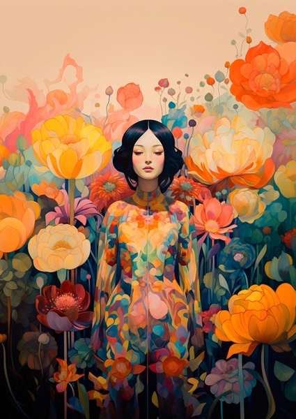 "Eple" poster av Nur Rydberg. Elma står midt i en eksplosjon av varme farger og blomster som nesten hvisker hemmeligheter fra en botanisk drømmeverden. Hun er rolig, men samtidig full av en slags stille kraft – som om hun er selve naturens vokter med et blikk som ser mer enn bare det synlige. Denne grafiske illustrasjonen er som en visuell klem fra blomsterengens sjel, med farger som puster liv og en aura av mystikk som drar deg inn. Ikke bare et bilde – en følelse du vil ha på veggen.