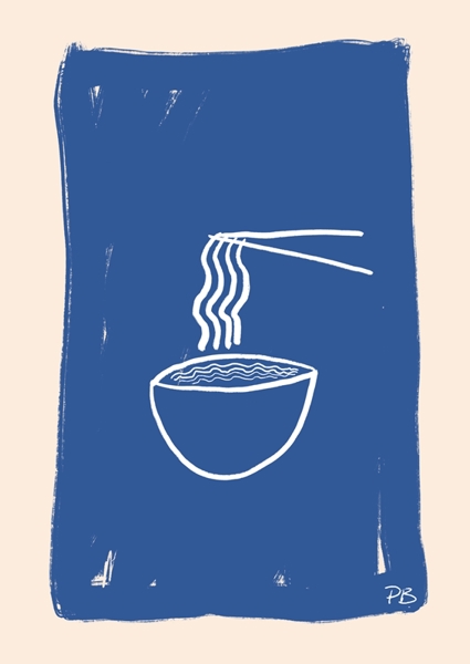 "Litt nudler" poster av Patrick Benabou. En skisse som fanger essensen av enkelhet med et hint av lek. Hvite nudler slynger seg opp fra en bolle, løftet av spisepinner – alt mot en dyp, blå bakgrunn som nesten roper etter oppmerksomhet. Minimalistisk, men likevel full av karakter. Perfekt for den som digger matkunst med et moderne, avslappet uttrykk. Litt som en visuell high five til comfort food-fansen.