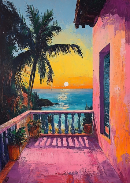 "Henri Matisse-inspirert " poster av Niklas Soleil. Solnedgangens varme farger maler en drømmeaktig balkong med palmer som svaier lett i vinden. Den rosa terrassen og det dype blå havet smelter sammen i en harmonisk dans, inspirert av Henri Matisse. Bildefrekvensen av middelhavets magi, hvor lyset leker lekent med skygger og farger – en perfekt flukt til varme kyster uten å forlate rommet ditt. Klar for litt kunstnerisk sommerfølelse?