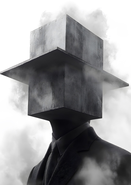 "In this artwork, geometric shapes and human silhouette merge into a fascinating puzzle. The viewer is invited to explore the depths of abstraction and decipher the hidden meanings. The clear lines and sharp edges contrast with the soft, misty environment, creating an exciting dynamic. "