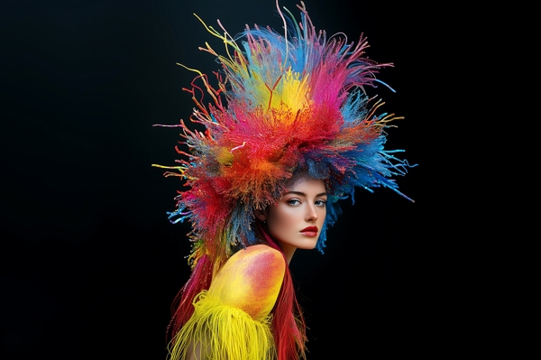 "Kvinne med fargerikt hodeplagg" poster av Jürgen Moers. Et portrett som kaster alt annet i skyggen – en kvinne med et heftig hodeplagg som eksploderer i farger som en neonfestival på hodet. Denne ville trådmassen danser vilt, nesten som om den har sin egen personlighet, og står knallhardt mot den sorte bakgrunnen. Det er som om kreativiteten har tatt form og nekter å holde seg innenfor noen linjer. Perfekt hvis du liker kunst som ikke bare snakker, men roper. Men vent… dette er ikke bare et bilde, det er en fargebombe som utfordrer hver eneste grense.