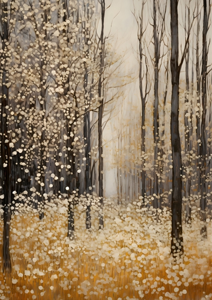 "Februar" poster av Nur Rydberg. Et magisk øyeblikk i en skog hvor trærne står ranke, omgitt av et hav av små, lysende prikker som kunne vært konfetti fra naturens egen fest. Fargene hvisker ro – dempet grått møter gyldent gress som stikker frem som en lun påminnelse om varme. Denne drømmeaktige reisen gjennom februarskogen føles nesten som en visuell klem, perfekt for rom som trenger et pust av stille magi. Vent, er det høst eller vår? Ja, akkurat den typen tvetydighet som gjør det kult.