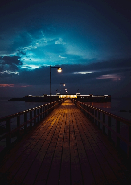 "Malmö Cold Bath House" poster av Jon Steine. Trå inn i den rolige kveldsstemningen ved Malmös cold bath house. En lang, trebelagt kai leder blikket mot et svakt opplyst badehus, hvor varme gatelys bryter mørket som et stille kompass. Dype blåtoner møter den kjølige svenske natten, og inviterer til en liten pause fra dagens mas. Perfekt for deg som digger den der litt melankolske, men samtidig beroligende vibben – som et øyeblikk fanget mellom nåtid og evighet.