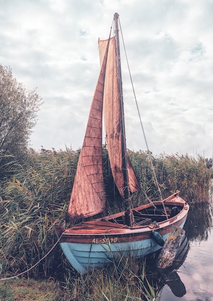"A poem about the picture: Once upon a time in Ahrenshoop... there was a small sailing boat. Its color was blue, not red, and it did not bear a woman's name. The red-brown sails waited for the wind, but the water lay still and the sky turned grey. I listened into the reeds, oh how I would like to be a coastal child."