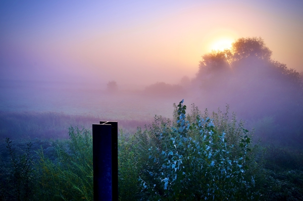 "Sunrise in the fog on meadow "