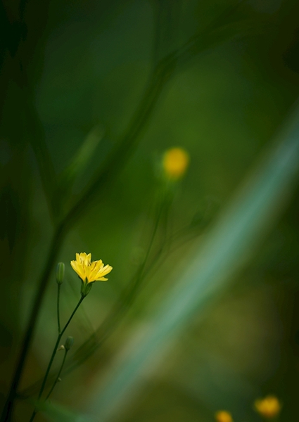 "Small yellow flower in the forest during a beautiful and warm summer day."