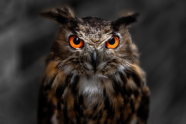 "Owl in close-up. The intensely clear eyes and the crisp color in the eyes create a dialogue in the viewing, albeit a silent one."