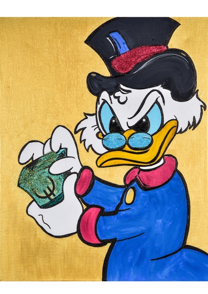 "Sknerus z euro" poster autorstwa Lana Graule. Scroodge McDuck w pełnej gotowości – trzyma zielony banknot z symbolem dolara, jakby zaraz zrobił kolejny finansowy ruch. Jego nieugięte spojrzenie zza niebieskich okularów i klasyczny kapelusz kontrastują z błyszczącym, złotym tłem, które emanuje bogactwem i ambicją. Ta żywa, kreskówkowa scena to hołd dla ikonicznego szczura finansów, idealna dla tych, którzy kochają popkulturę i odrobinę humoru w sztuce. Lekko zadziorna, ale pełna charakteru – jak sam Scroodge.