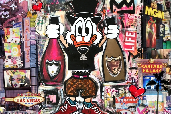 "Sknerus McDuck − Vegas" poster autorstwa Stefan Bammert. Scrooge McDuck w wersji hipstera, trzymający w dłoniach butelki szampana niczym trofea – to hołd dla życia na pełnej petardzie, prosto z Las Vegas. Mieszanka kolażu i akrylu eksploduje energią popkultury, łącząc miejskie klimaty, modę i nostalgiczną zabawę. Ten obraz to czysta impreza na płótnie, idealna dla tych, którzy znają wartość życia na luzie i z humorem. Vegas, baby!