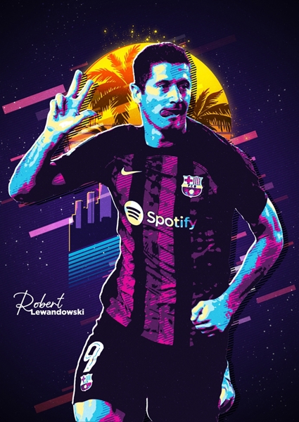 "Robert Lewandowski Barcelona" poster autorstwa IDN WORK SPACE. Robert Lewandowski w neonowej odsłonie Barcelony – to nie tylko hołd dla piłki, ale i dla stylu lat 80. Palmy, pulsujące kolory i miasto w tle tworzą klimat, który każe poczuć energię i magię boiska. Ten obraz to eksplozja pasji i talentu, idealny dla fanów futbolu, którzy chcą mieć w domu kawałek sportowej historii z nutą retro. Po prostu energia, która nie pozwala usiedzieć spokojnie!