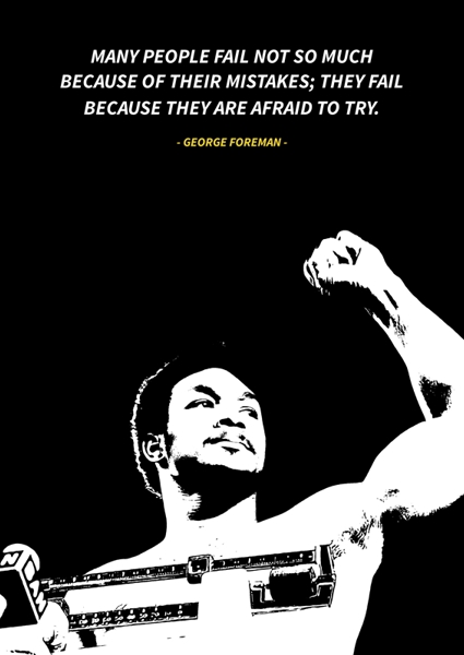 "George Foreman cytuje " poster autorstwa Lunziii art. Czarno-biała ilustracja George’a Foremana emanuje siłą i determinacją. Jego sylwetka, wyraźnie zarysowana na ciemnym tle, unosi pięść w geście zwycięstwa – prawie słychać echo sportowej walki i ducha nieustępliwości. Cytat o strachu przed próbą trafia prosto w punkt, jak cios, który zmienia perspektywę. To motywacyjny klasyk, który od razu wciąga i przypomina, że największa porażka to nie działanie, a strach przed nim. Idealne do przestrzeni, gdzie trzeba przypomnieć sobie, by nie odpuszczać.