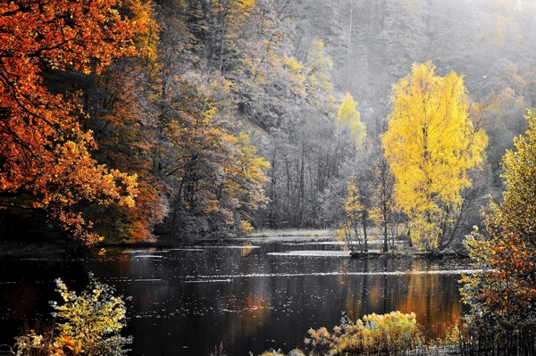 "Jesień w Skanii " poster autorstwa Stefan Vackenfeldt. Oto jesień w Skåne, ale nie taka zwyczajna. Ogniste pomarańcze i złote żółcie wyrywają się z monochromatycznego tła, jakby natura postanowiła zrobić mały bunt. Spokojne jezioro odbija te eksplozje barw, zapraszając na spacer po szlakach, gdzie każdy krok to mała przygoda. To dzieło to jak snapchat z jesieni – chwila zatrzymana i podkręcona kolorem, który mówi „hej, zobacz, jak wygląda magia Szwecji, kiedy liście tańczą”.
