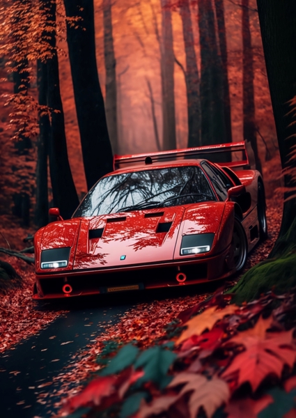 "Experience the thrill of a Ferrari F40 as it roars through a vibrant red forest. This automotive masterpiece merges speed with nature's beauty."