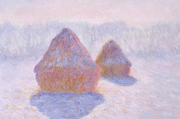 "Haystacks (Effect of Snow and Sun) (1891) by Claude Monet depicts a sunlit, snow-covered haystack. Gentle brushstrokes and soft colors highlight Monet’s mastery of light and nature."