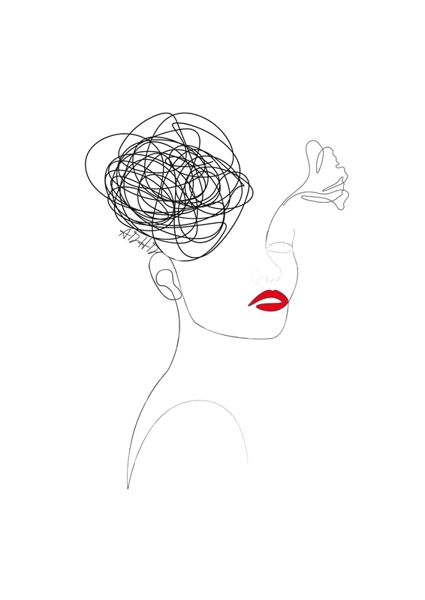 "ADHD (ADHD)" poster autorstwa Jasmine Herhold. Minimalistyczna sylwetka kobiety, której głowa to wirujący chaos linii – jakby myśli zatańczyły breakdance. Czerwień ust rzuca się w oczy i mówi „hej, tu jestem!” na tle monochromatycznego zamieszania. Delikatny kwiat to ten niespodziewany moment piękna i kreatywności w środku mentalnej burzy. To obraz dla tych, którzy wiedzą, że w nieładzie też jest styl i energia. ADHD jak żywe, ale z klasą.